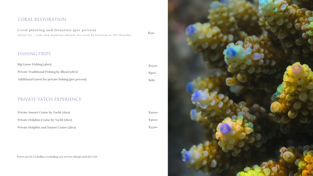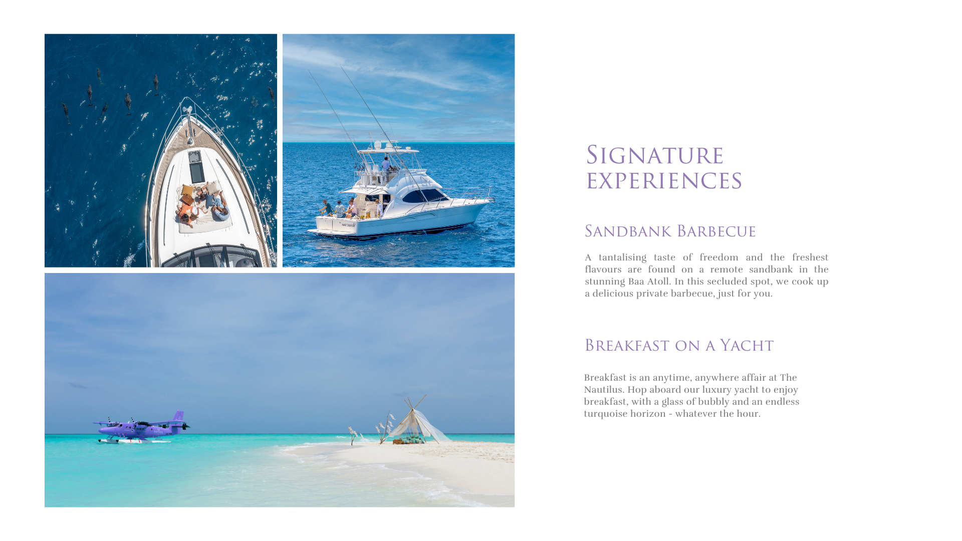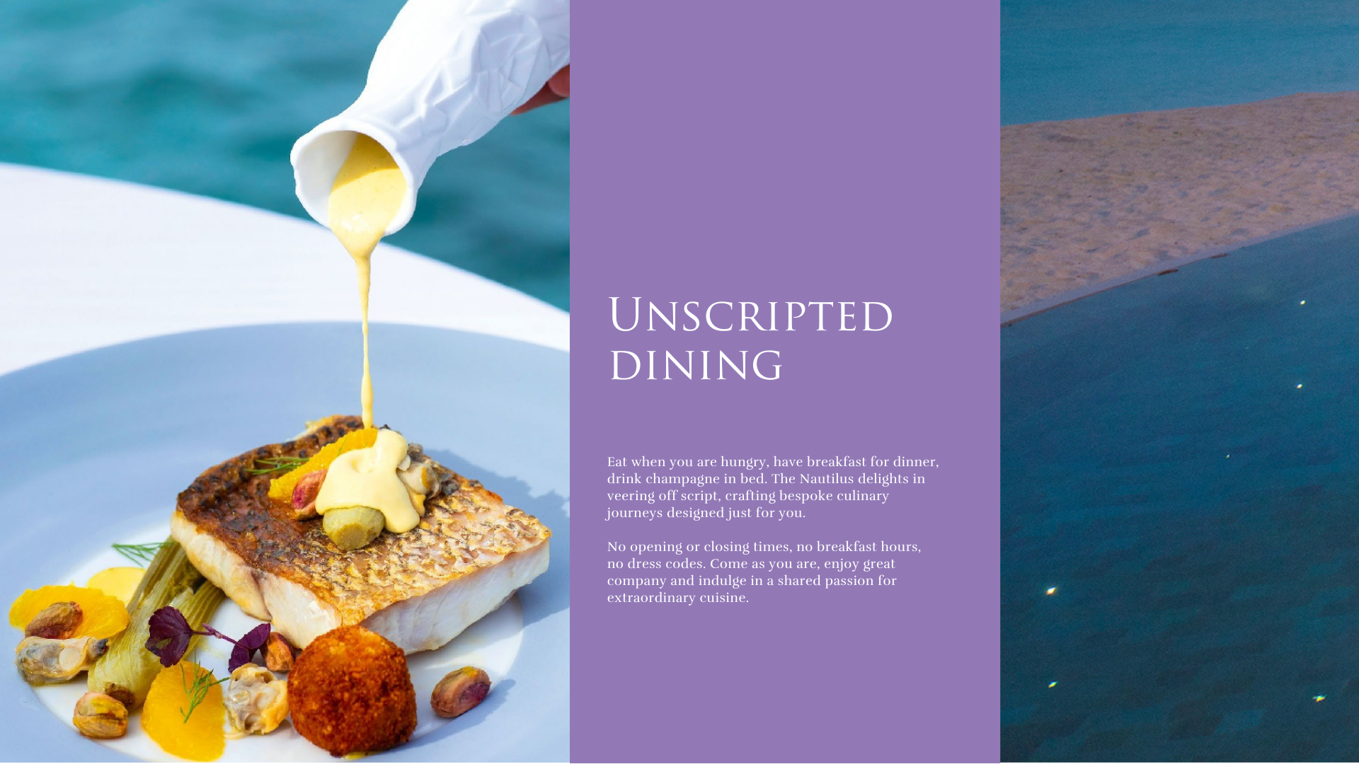 The Nautilus delights in veering off script, and in allowing you to direct your own excursions. From impromptu experiences on crystal clear waters, to adventures undersea and soaring over atolls. Your experience is one of liberation at every turn.