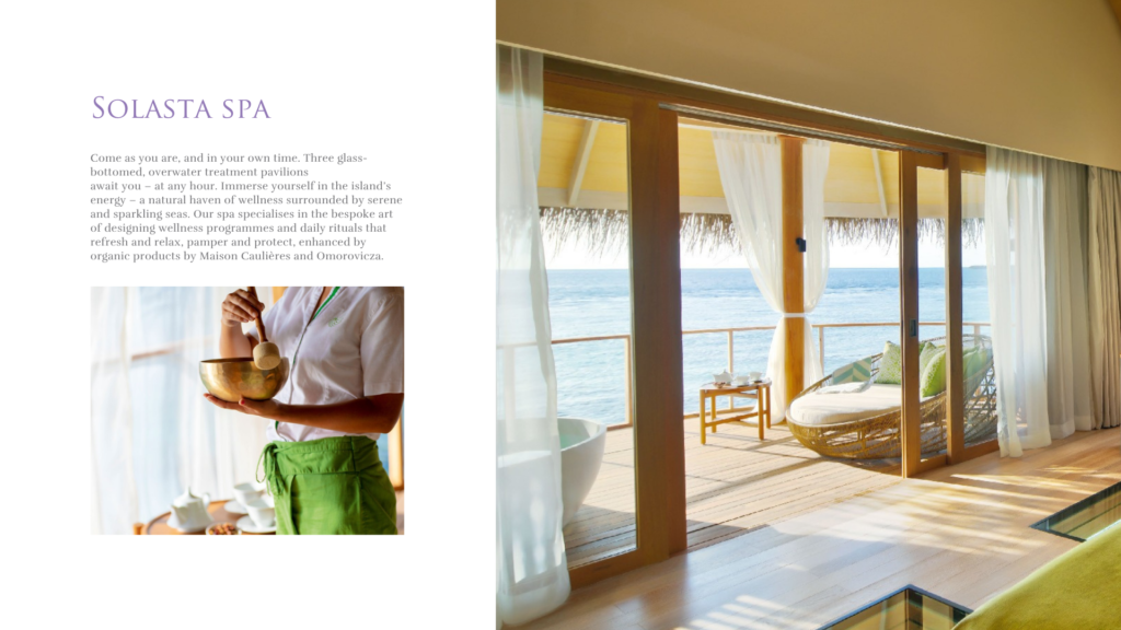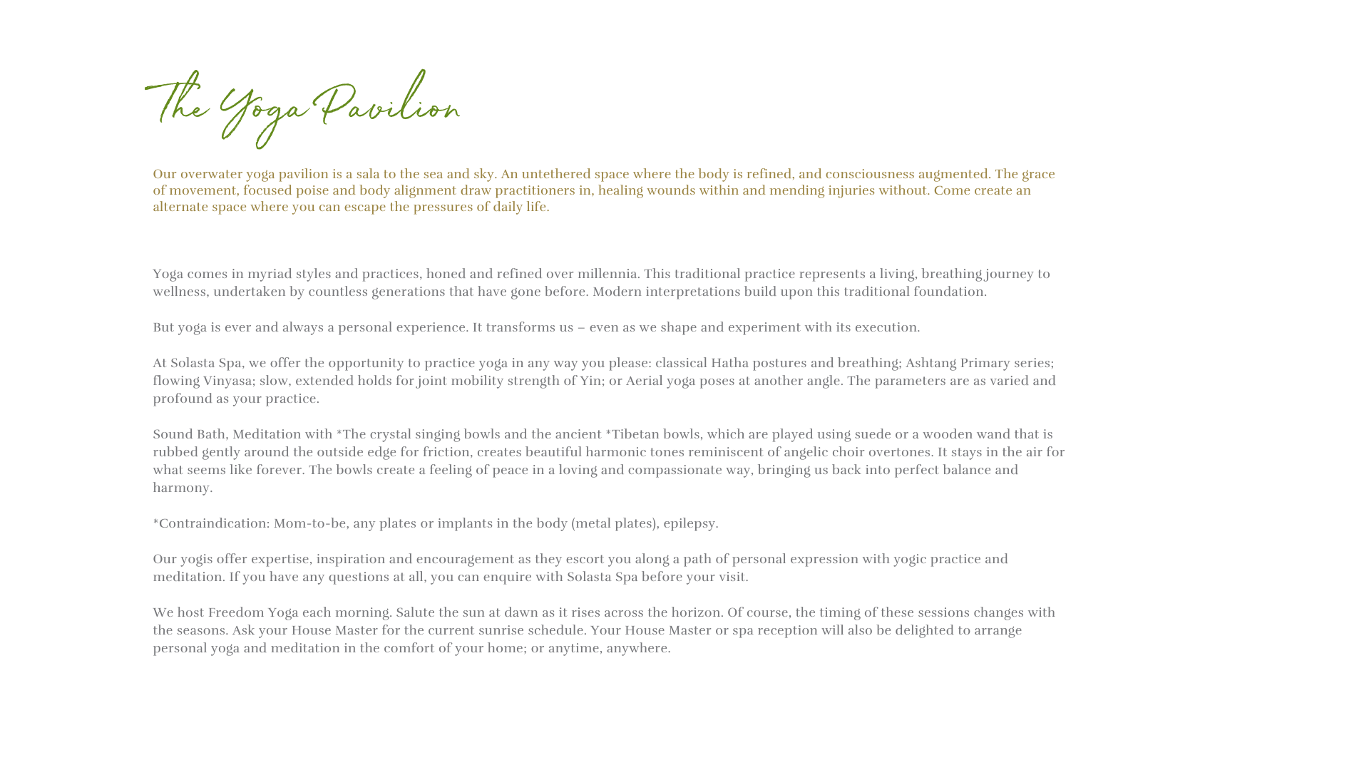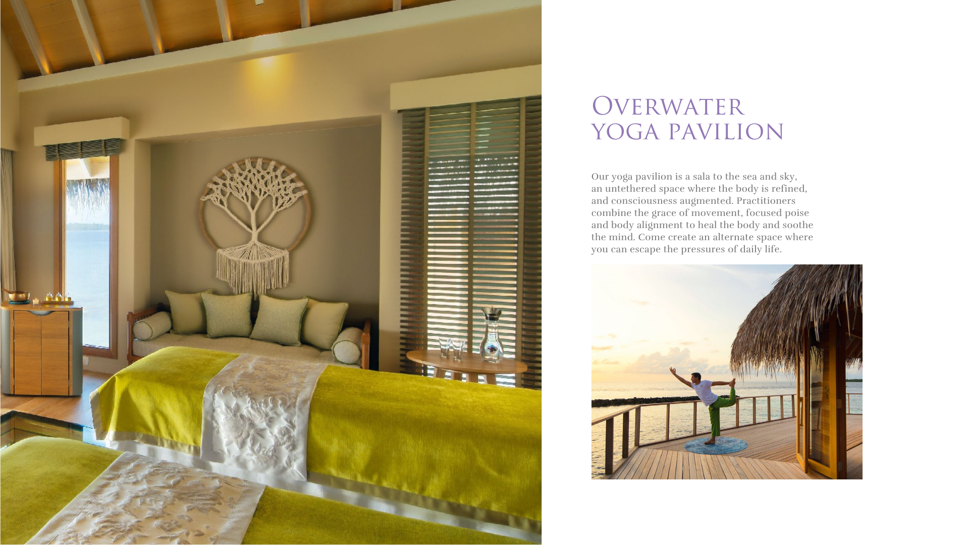 Immerse yourself in the energy of the island's Solasta Spa, a natural haven of bespoke wellness surrounded by serene and sparkling seas. Visit our overwater yoga pavilion and indulge in a sanctuary of movement, mindfulness and release.