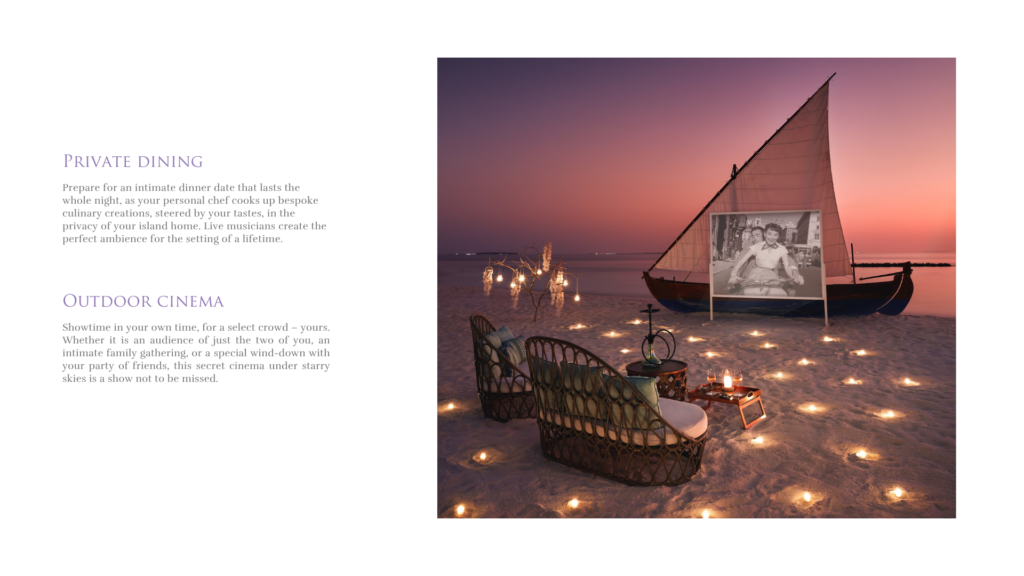 On a secluded sandbank, surrounded by clear blues and the uninterrupted rhythm of the waves. An exquisite setup, a bespoke menu – all dedicated to you. An intimate soirée set to create the most magical memories.